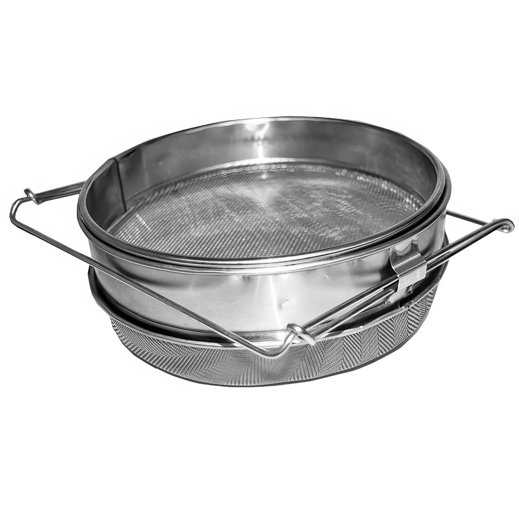 Honigsieb Ø 24 cm rostfrei. Solide Herstellung. Das Sieb hat auch verstellbare halterung, dadurch ist einfach zu aufhängen auf Behälter mit verschiedenen Durchmesser bis max. 37 Durchmesser.