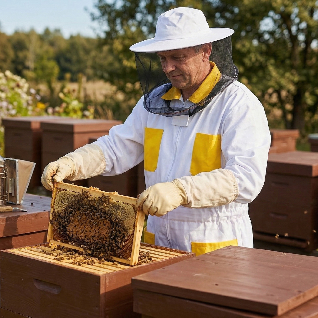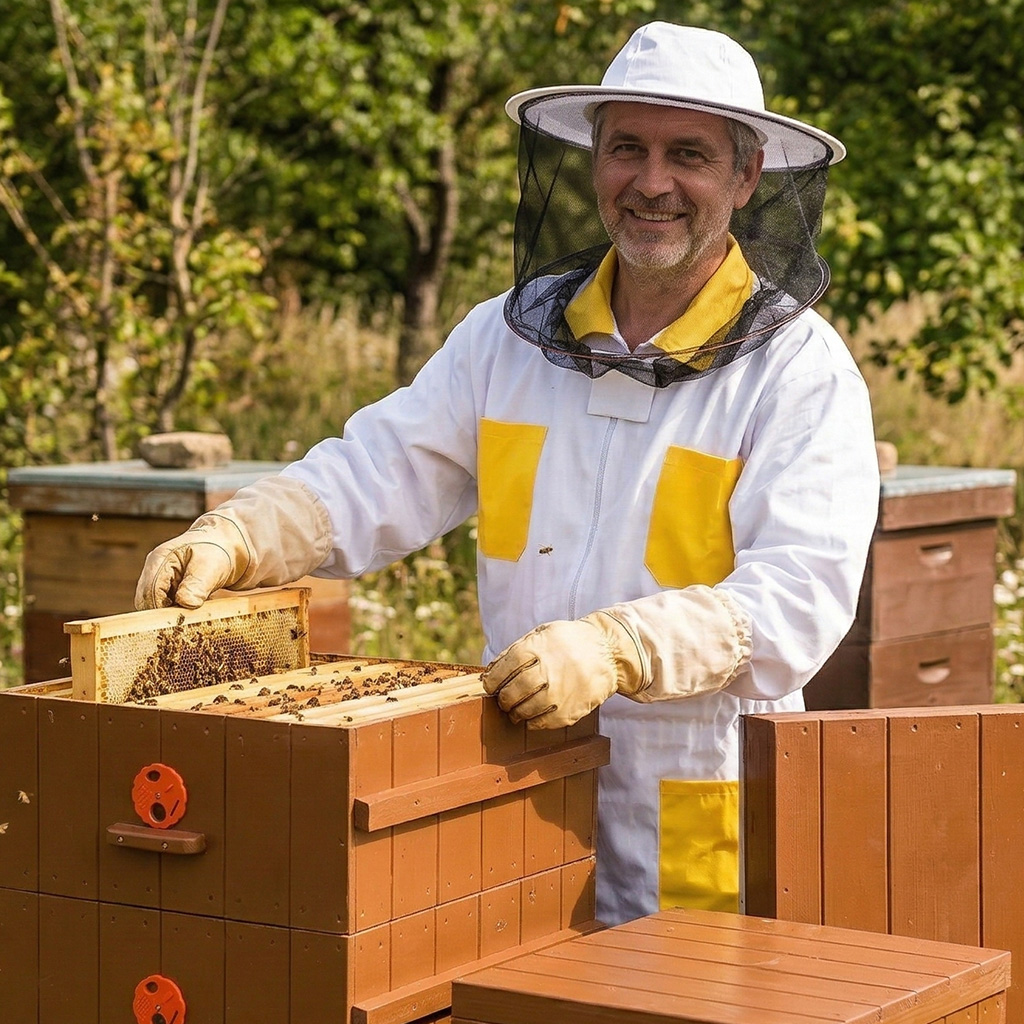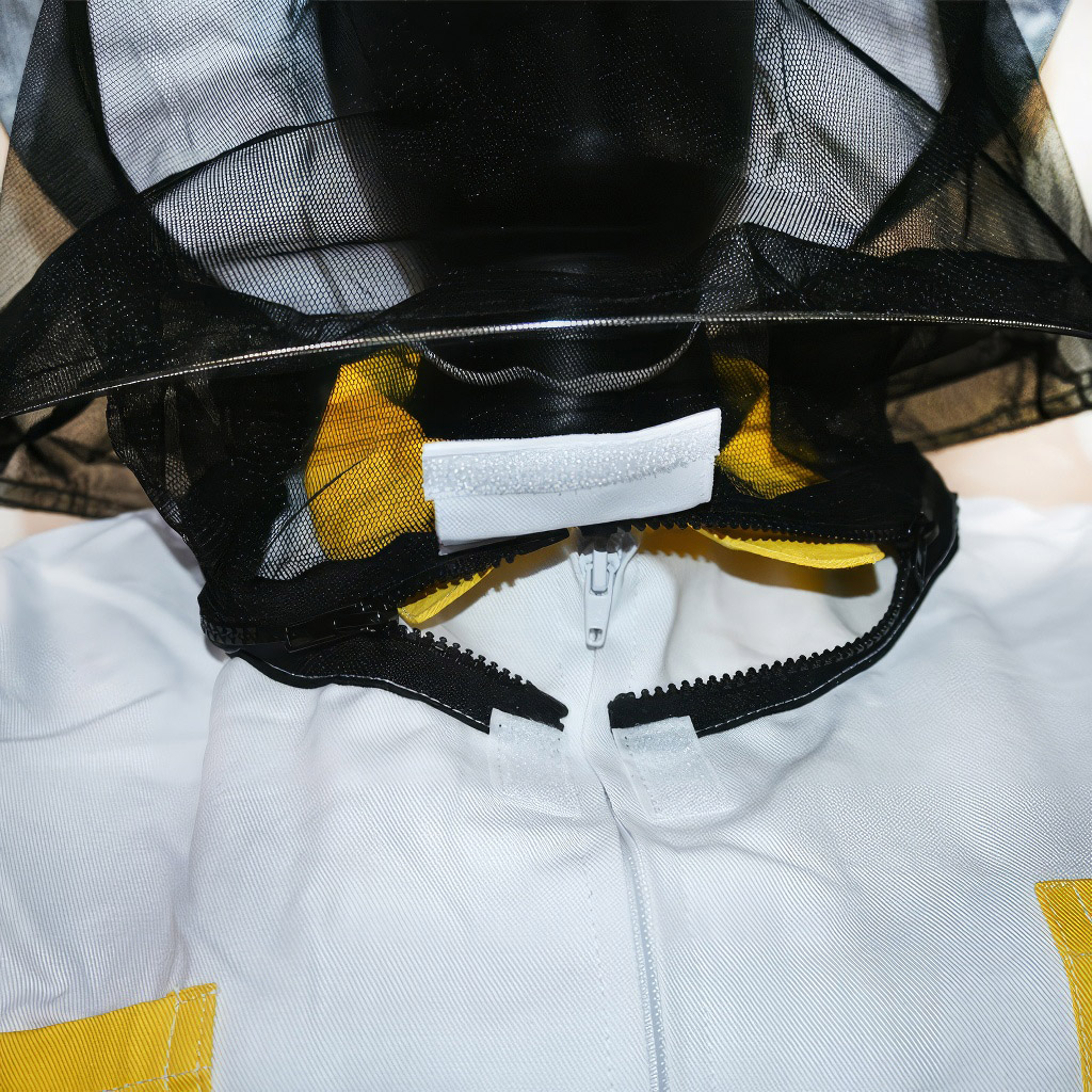 Kombination aus klassischer Imkerjacke mit Wulstkragen und einem Zuzieh-Schleier. Mit vier großen Taschen, abnehmbaren Hut, Gummibändchen an Ärmeln, 100% Weiß - gelb Farben, voll waschbar. Tragekomfort, angenehm und sicher. Bitte wählen Sie Ihre Konfektionsgröße 48 - 68.