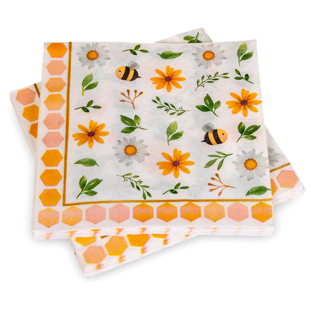 Möchten Sie Ihre Tischgestaltung beleben und zugleich dezent Ihre Verbundenheit zu Bienen, Honig und der Natur zeigen? Die Papierservietten mit dem Motiv „Bienen und Blumen“ verbinden ansprechendes Design mit solider Qualität. Es sind nicht nur Servietten „für den Verbrauch“ – sie dienen auch als kleine Dekoration, die Gäste bei gemütlichem Beisammensein ebenso erfreut wie Kunden bei einer Verkostung.